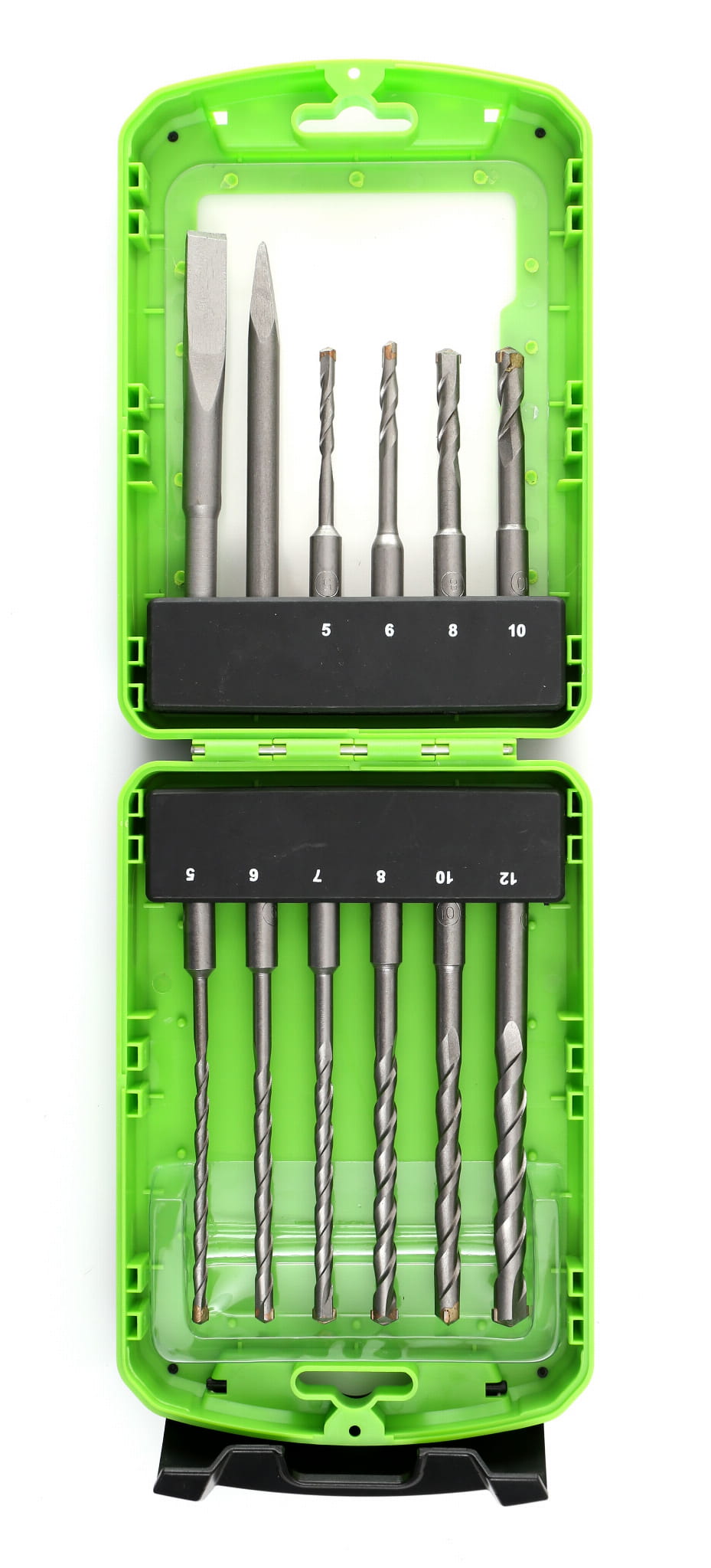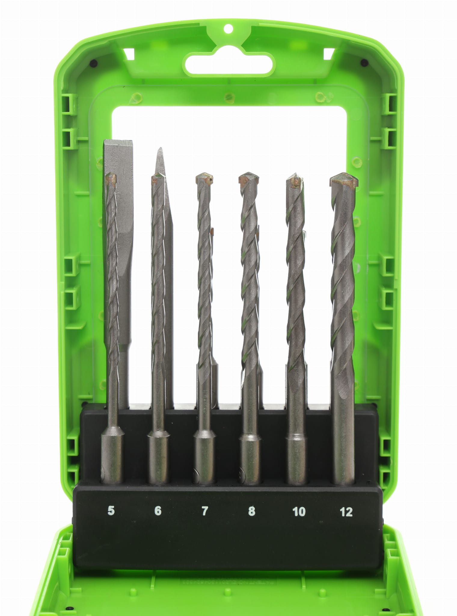 Zestaw zawiera wiertła w 6 różnych średnicach (5, 6, 7, 8, 10 i 12 mm) oraz dwóch długościach (110 mm i 160 mm), co pozwala dopasować narzędzie do głębokości i charakteru otworu bez konieczności dokupowania pojedynczych wierteł.