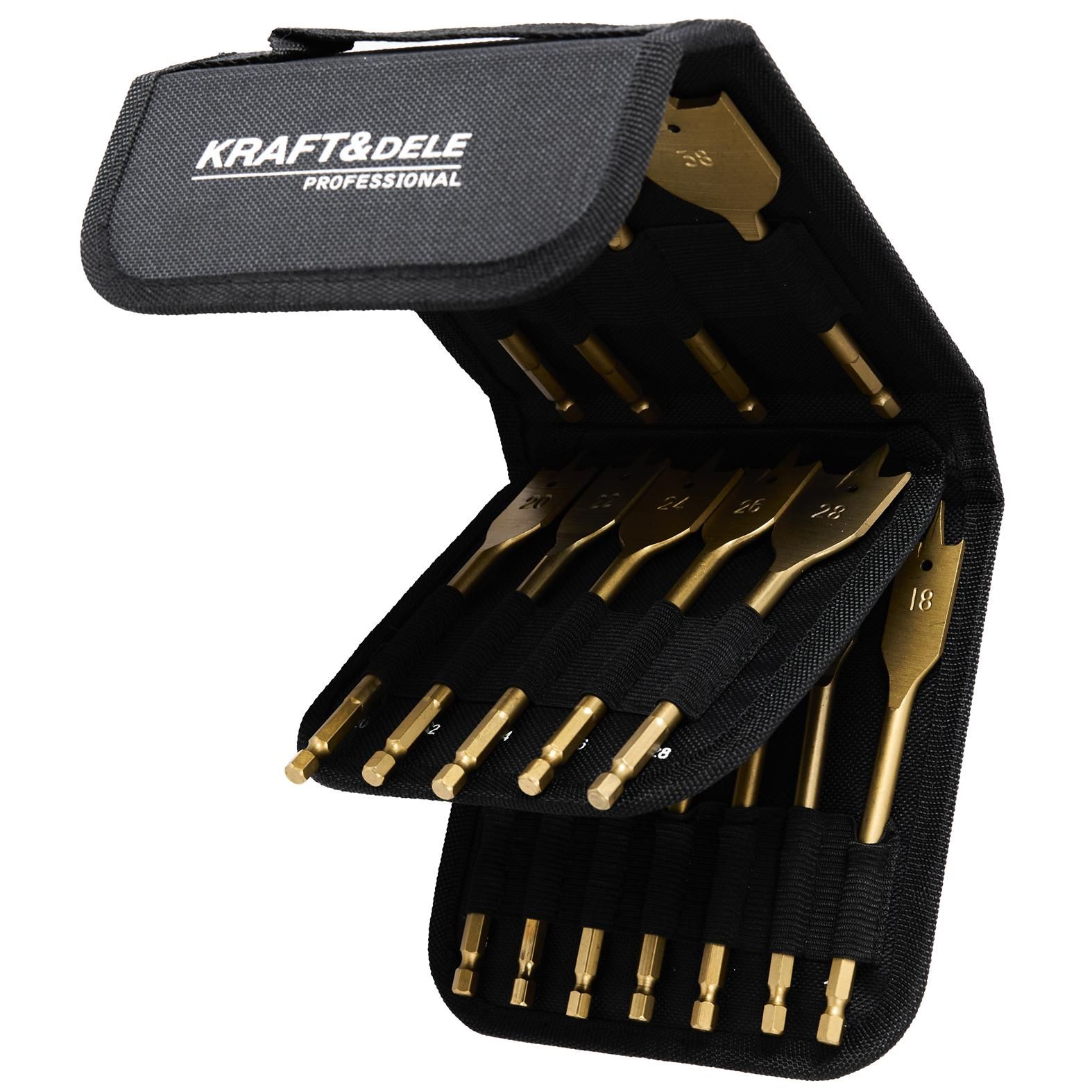 Zestaw wierteł łopatkowych KRAFT&DELE KD10637 pozwala dopasować średnicę do typowych zadań w drewnie i płycie meblowej bez dokupywania kolejnych sztuk.