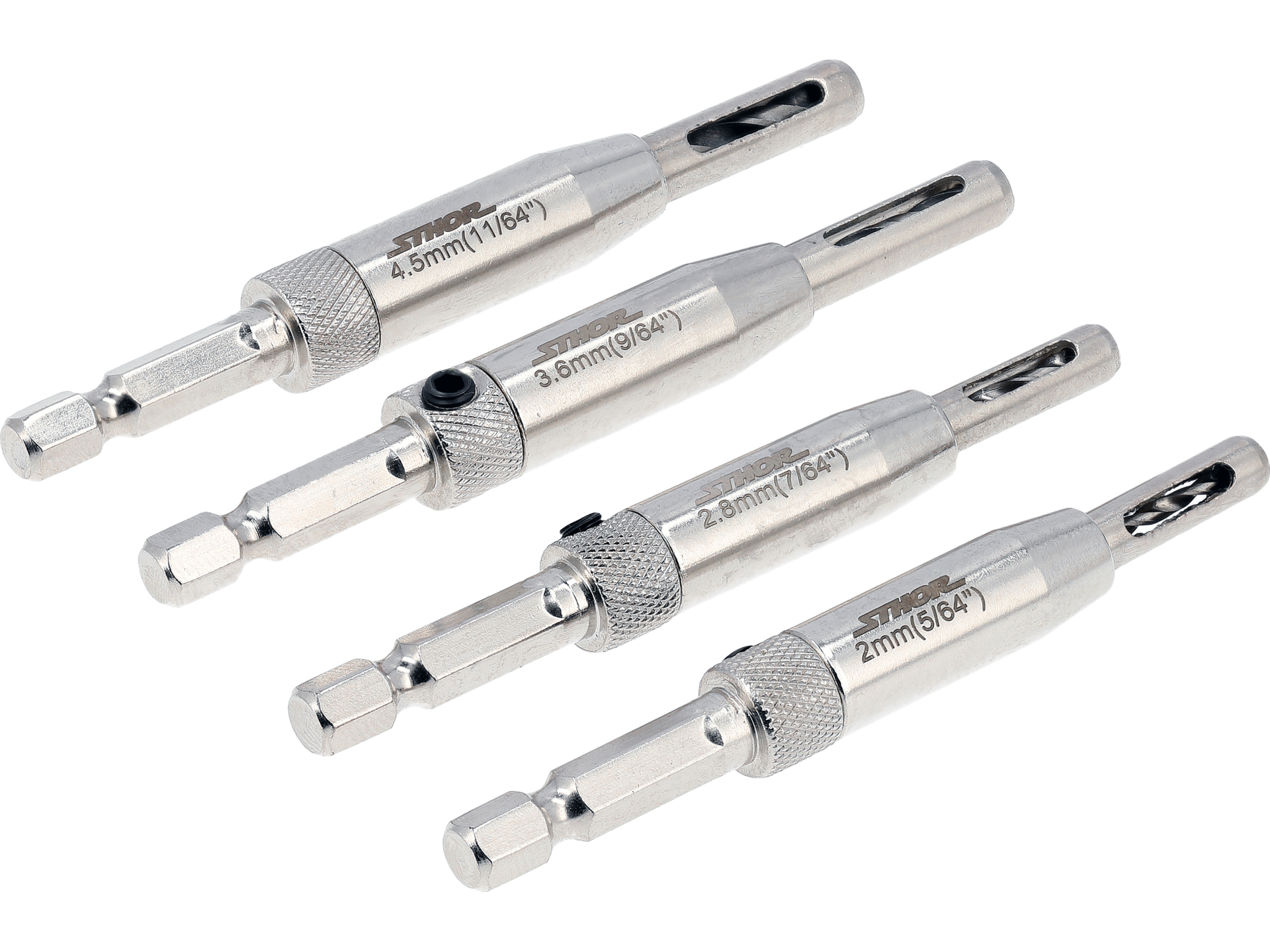 Komplet wierteł samocentrujących do drewna, tworzyw sztucznych i metali miękkich. Konstrukcja z prowadnicą eliminuje konieczność punktowania i zapewnia precyzyjne wyśrodkowanie otworów montażowych pod zawiasy, prowadnice i okucia meblowe.