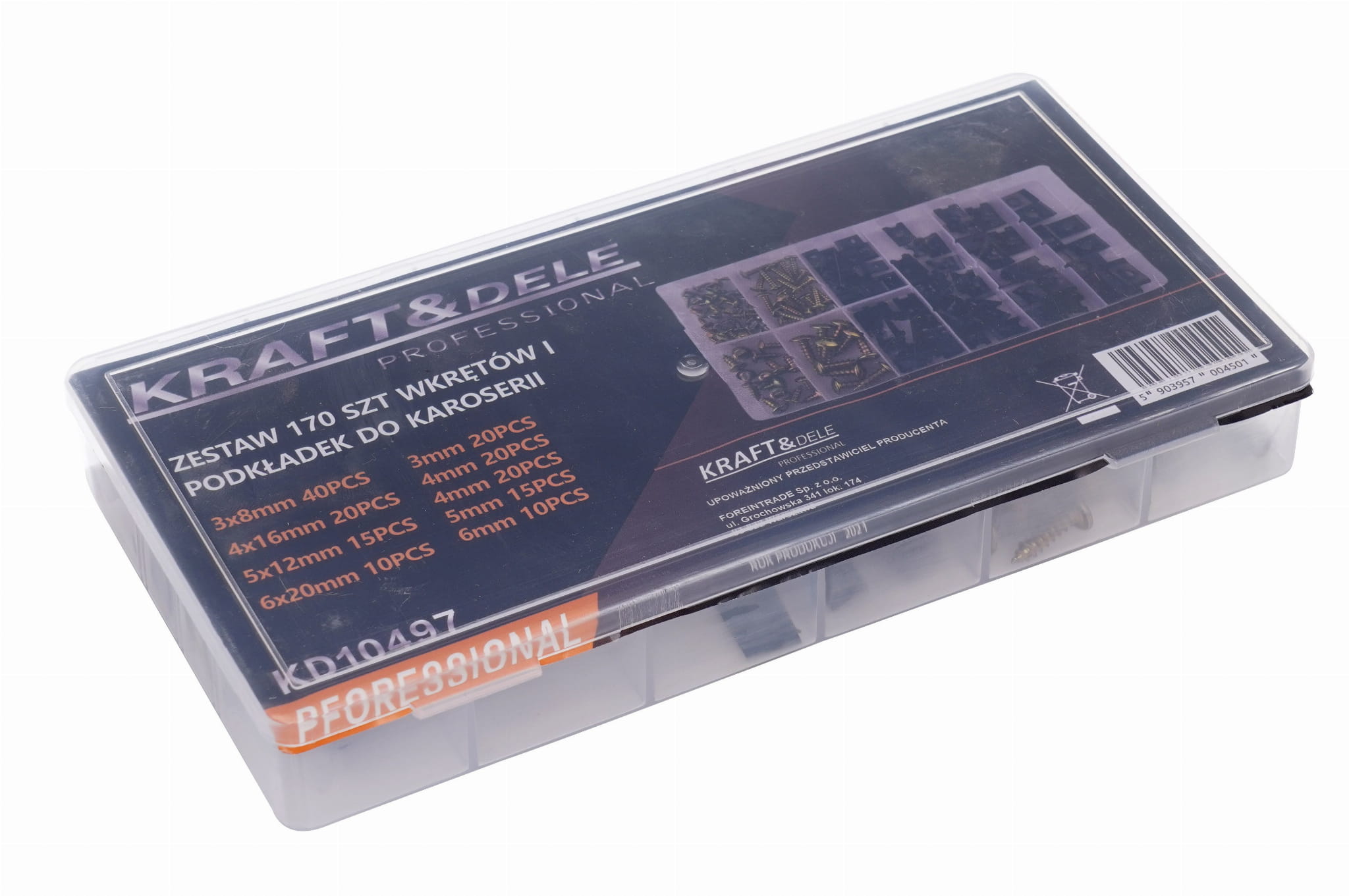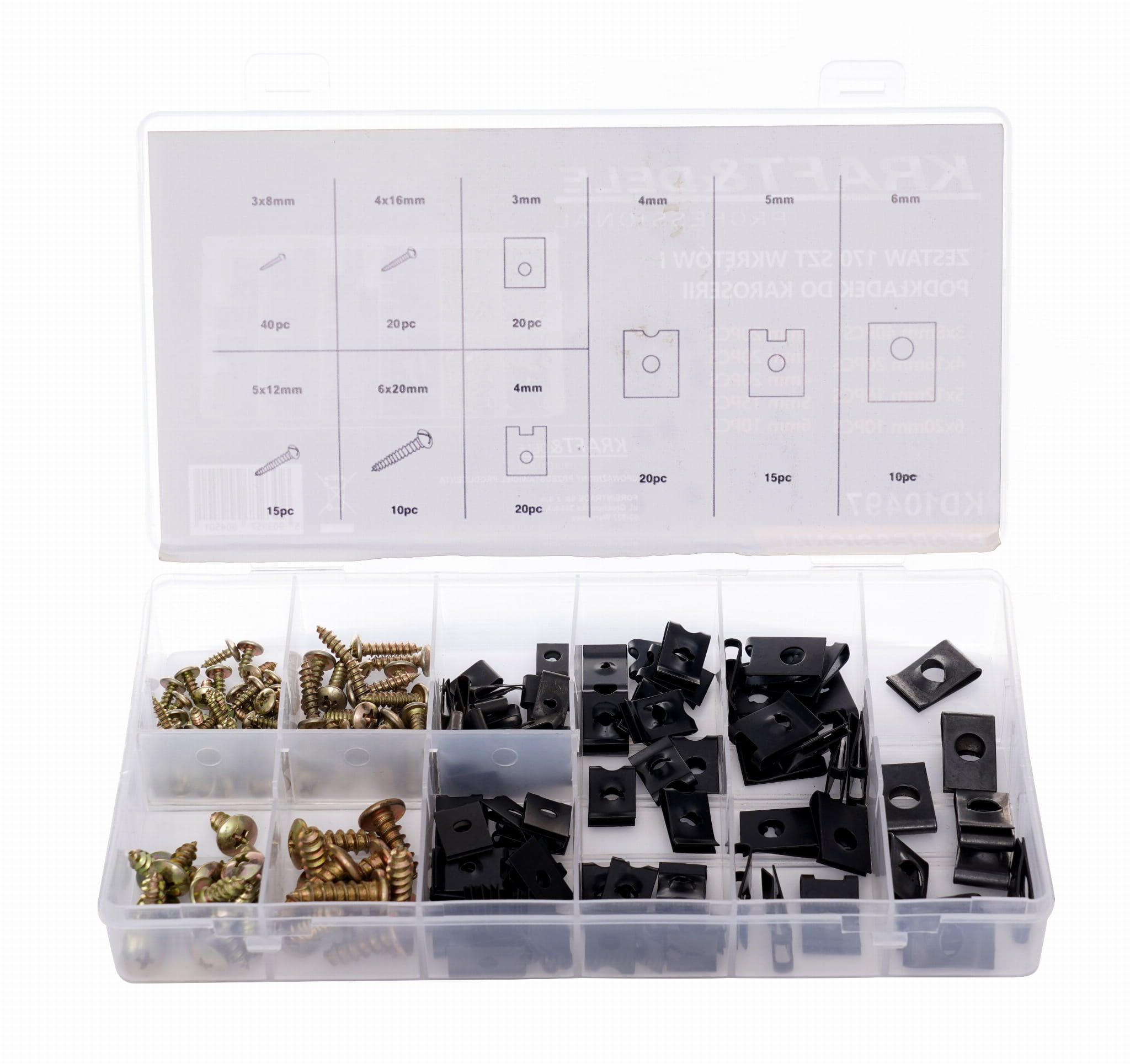 Zestaw obejmuje 170 sztuk wkrętów samogwintujących i podkładek przeznaczonych do montażu oraz naprawy elementów karoserii i nadwozia. Elementy złączne dostępne są w zakresie średnic od 3 do 6 mm, co pozwala na realizację typowych prac blacharskich i montażowych bez konieczności kompletowania poszczególnych rozmiarów osobno. Zestaw dostarczany jest w sortowniku ułatwiającym przechowywanie i szybki dostęp do potrzebnego rozmiaru.