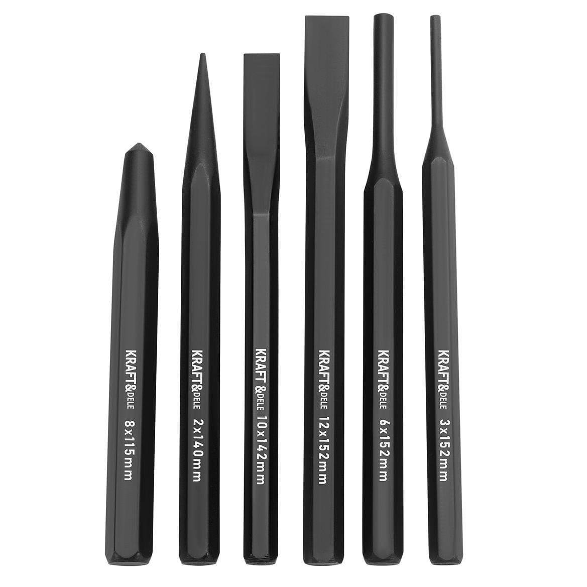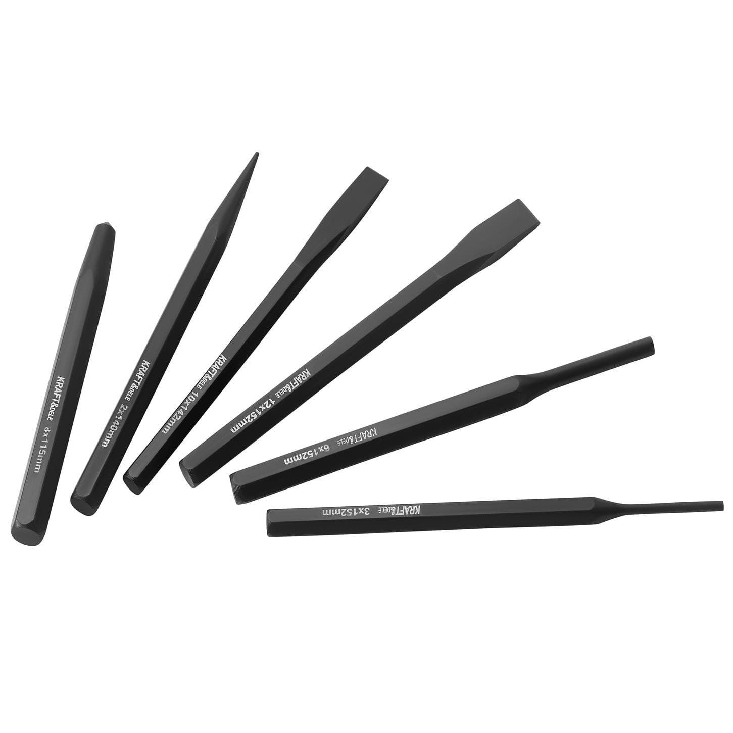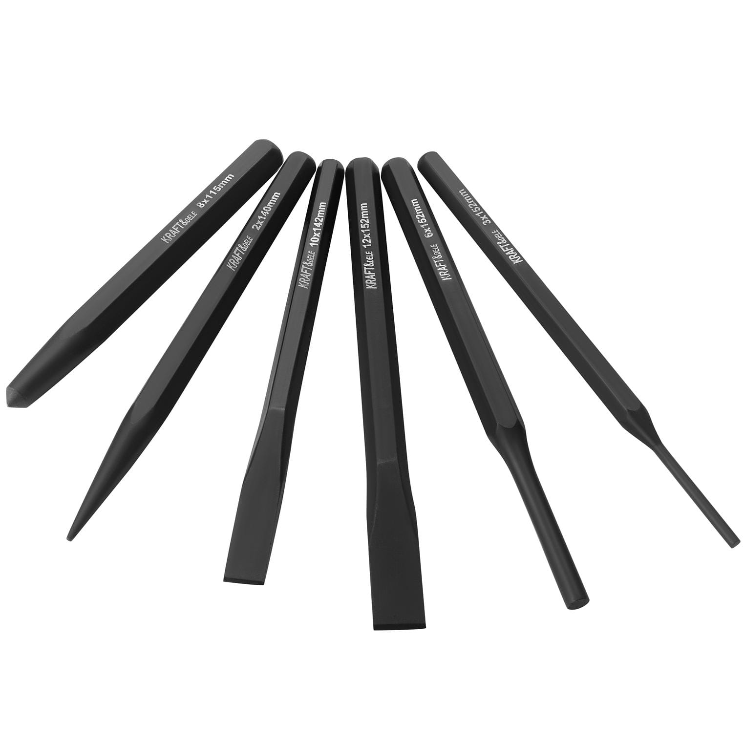 Komplet sześciu narzędzi udarowych ze stali chromowo-wanadowej (CRV), obejmujący punktak, wybijak stożkowy, dwa wybijaki walcowe oraz dwa przecinaki. Zestaw pokrywa podstawowy zakres potrzeb warsztatowych przy pracach montażowych, demontażowych i ślusarskich.