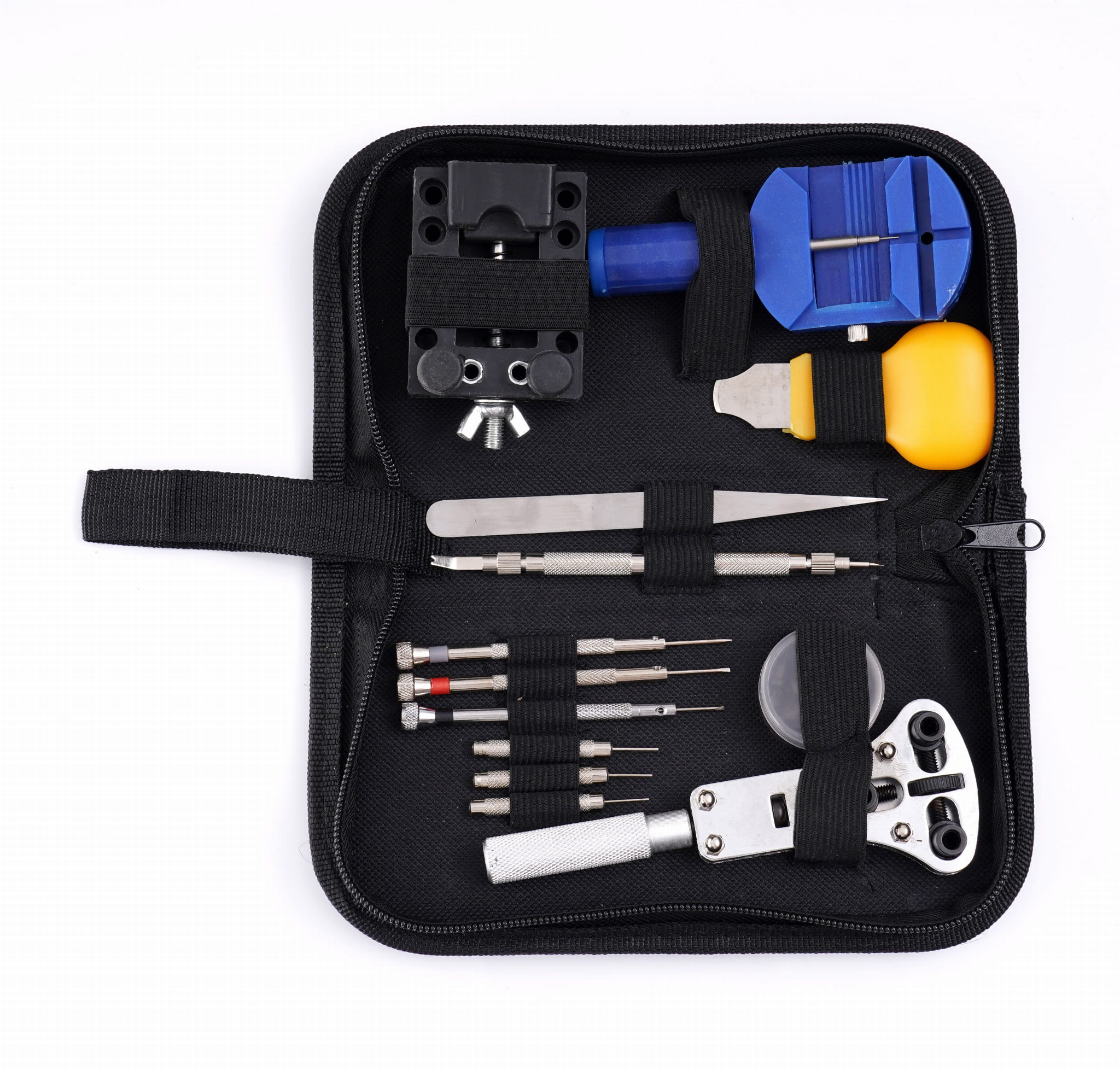 Komplet narzędzi przeznaczonych do podstawowych i zaawansowanych prac przy zegarkach: wymiany pasków, skracania bransolet metalowych oraz otwierania i zamykania kopert zegarków. Zestaw obejmuje klucz z 18 końcówkami, narzędzia do teleskopów, śrubokręty oraz pęsetę — wszystko przechowywane w etui z dedykowanymi miejscami na każde narzędzie.