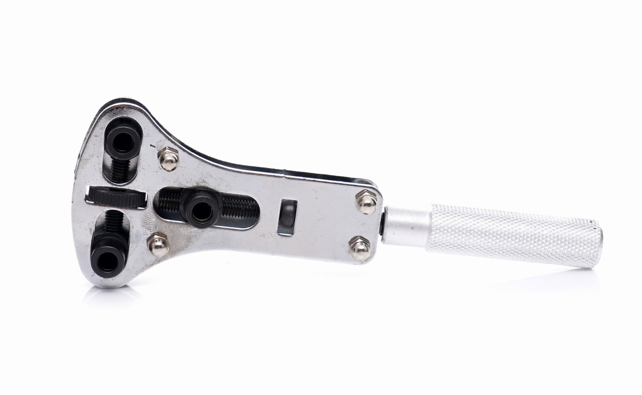 Regulowany klucz z wymiennymi końcówkami umożliwia otwieranie kopert zegarków o różnych średnicach i typach zamknięcia. 18 końcówek w zestawie pozwala dopasować narzędzie do szerokiej gamy modeli zegarków — zarówno z dekielkami nakręcanymi, jak i wcinanymi.