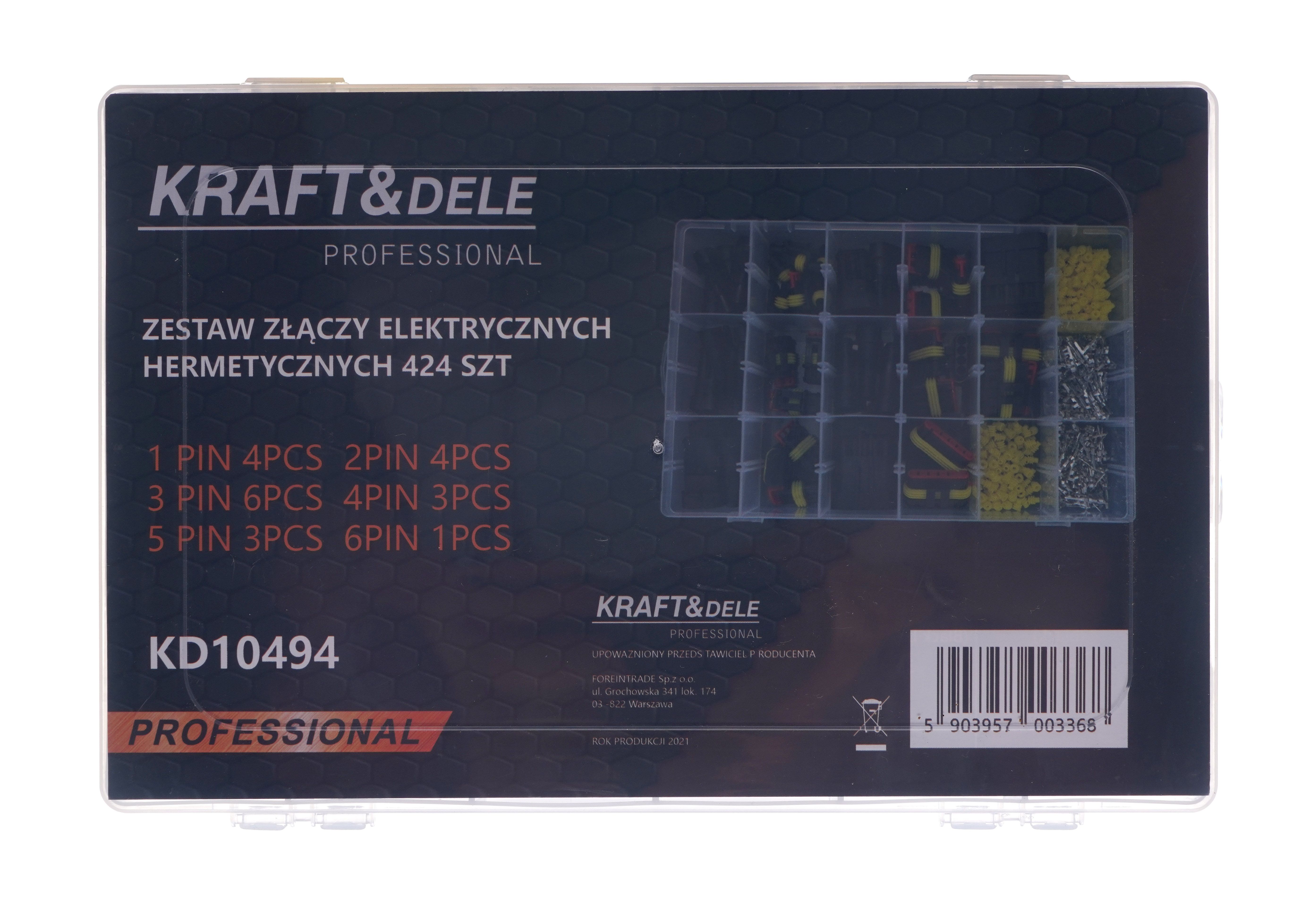 Złączki hermetyczne 424szt. KD10494 / KD10494 / KRAFT&DELE to rozsądny wybór, jeśli chcesz mieć pod ręką uniwersalny zestaw złączy elektrycznych w uporządkowanym opakowaniu. Model KD10494 łączy kompletność (424 szt.) z wygodą pracy dzięki rozmiarom 1–6-pinowym, co ułatwia codzienne montaże i serwis.