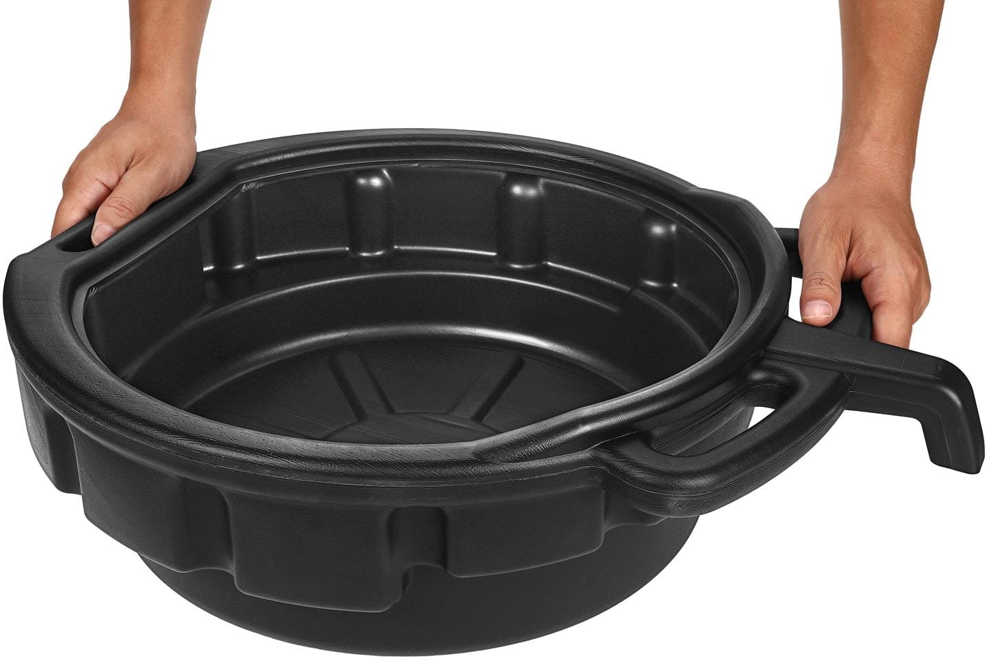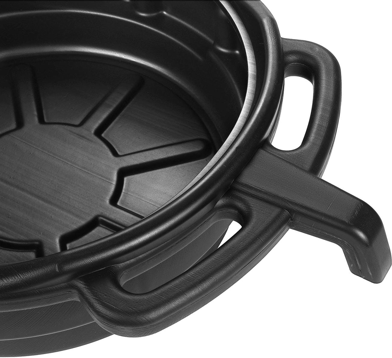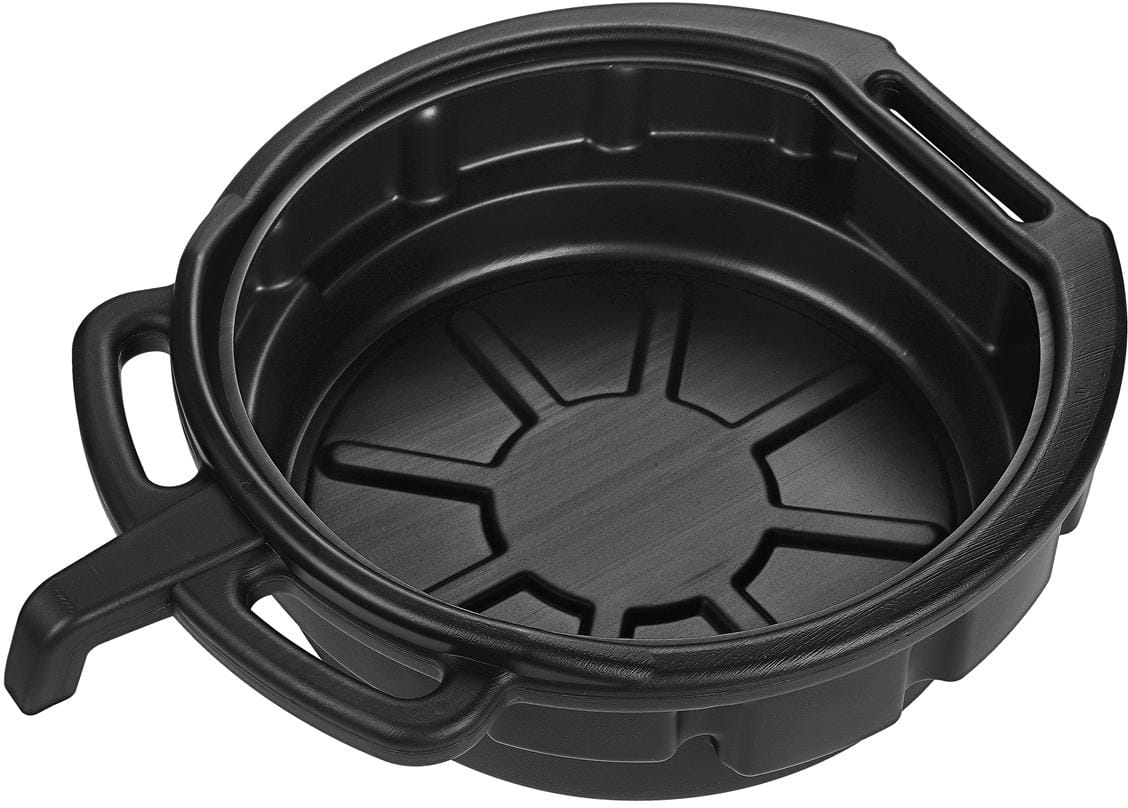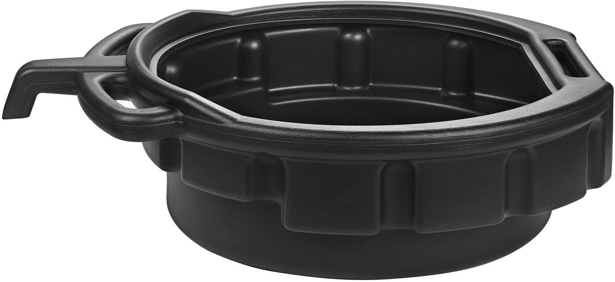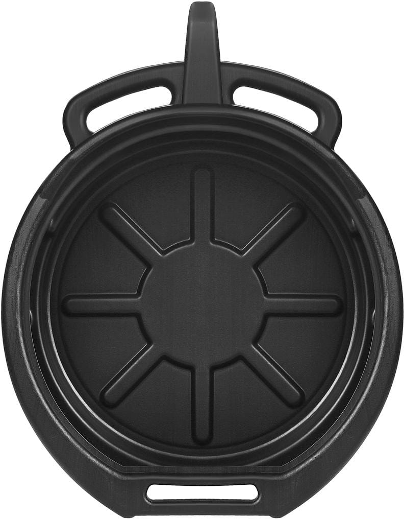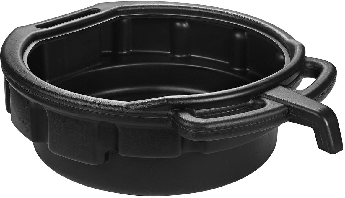 Wygodny uchwyt pozwala bezpiecznie przenosić napełnioną miskę. Przy pojemności 16 litrów i gęstości oleju silnikowego masa zawartości może wynosić około 14 kg — stabilny chwyt ogranicza ryzyko rozlania.