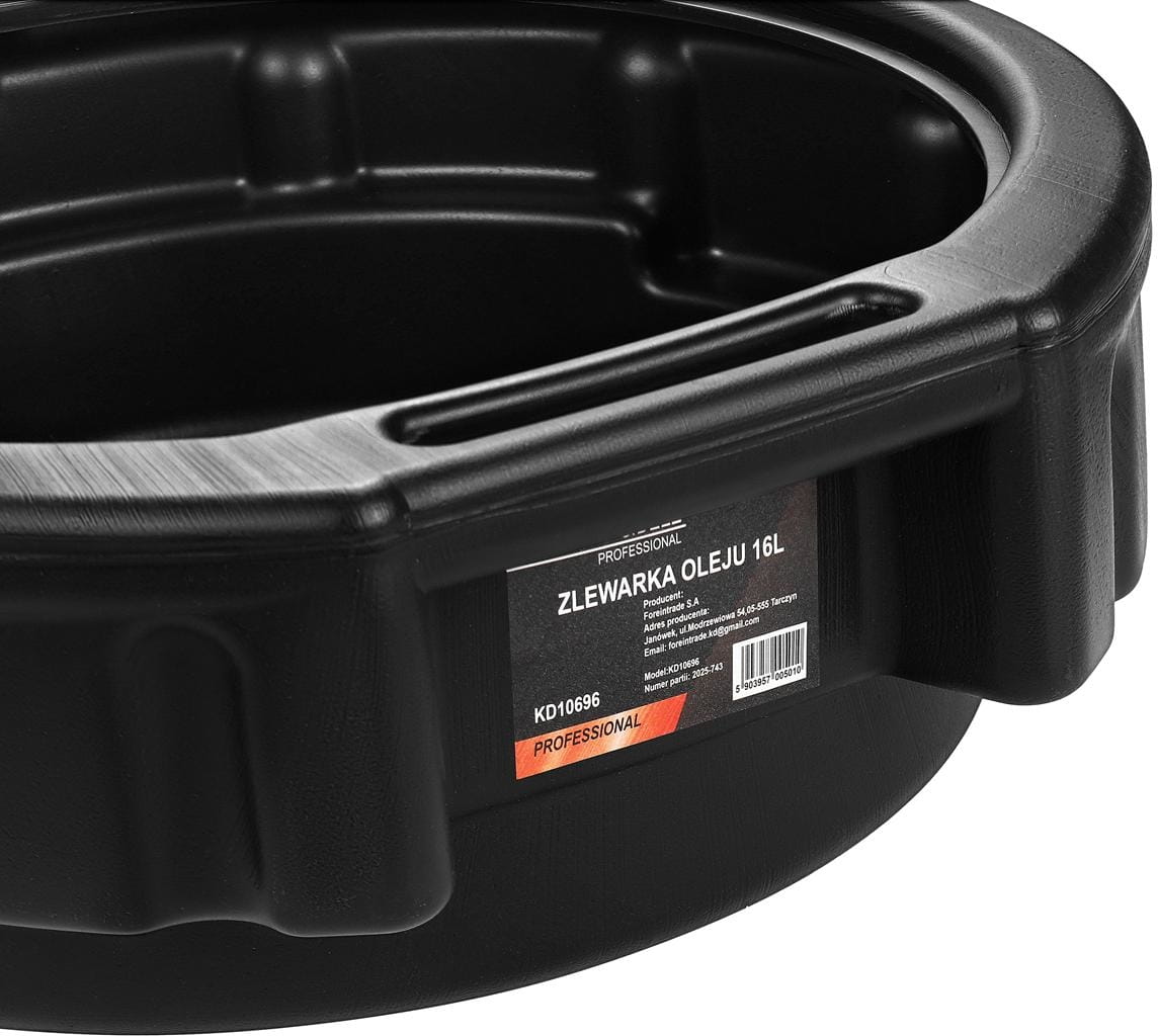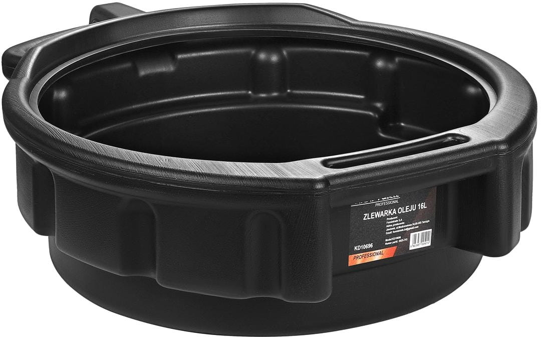 Zlewka warsztatowa KD10696 marki Kraft&Dele przeznaczona do zbierania oleju silnikowego, płynu chłodniczego oraz innych substancji eksploatacyjnych podczas prac serwisowych przy pojazdach. Pojemność 16 litrów pokrywa zapotrzebowanie przy większości standardowych wymian oleju w samochodach osobowych i dostawczych.
