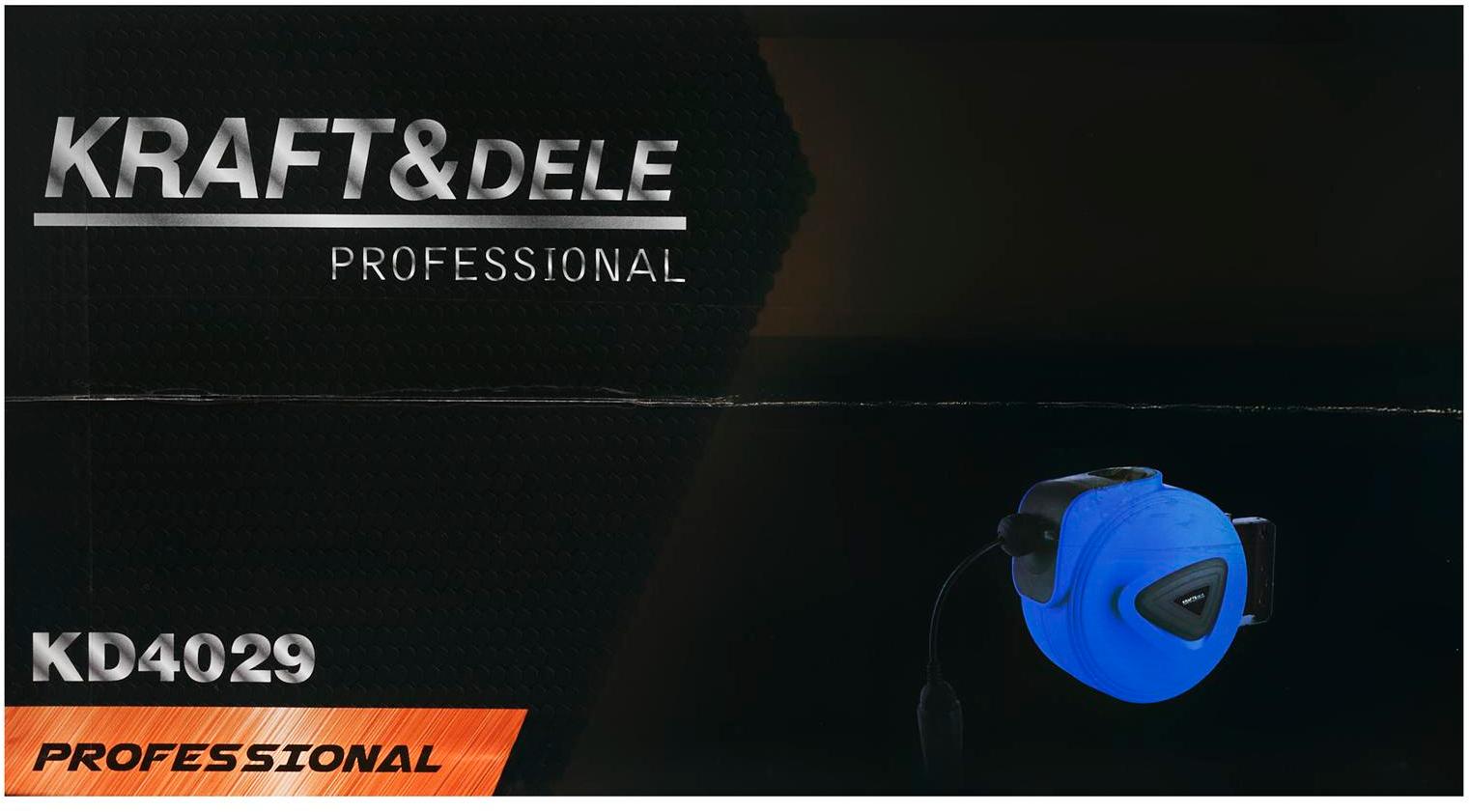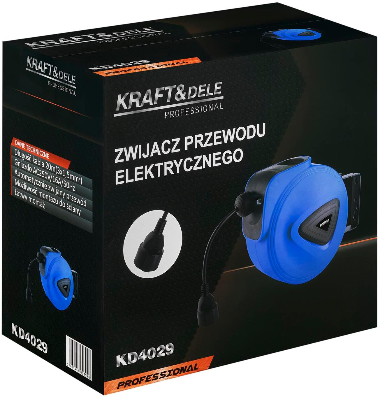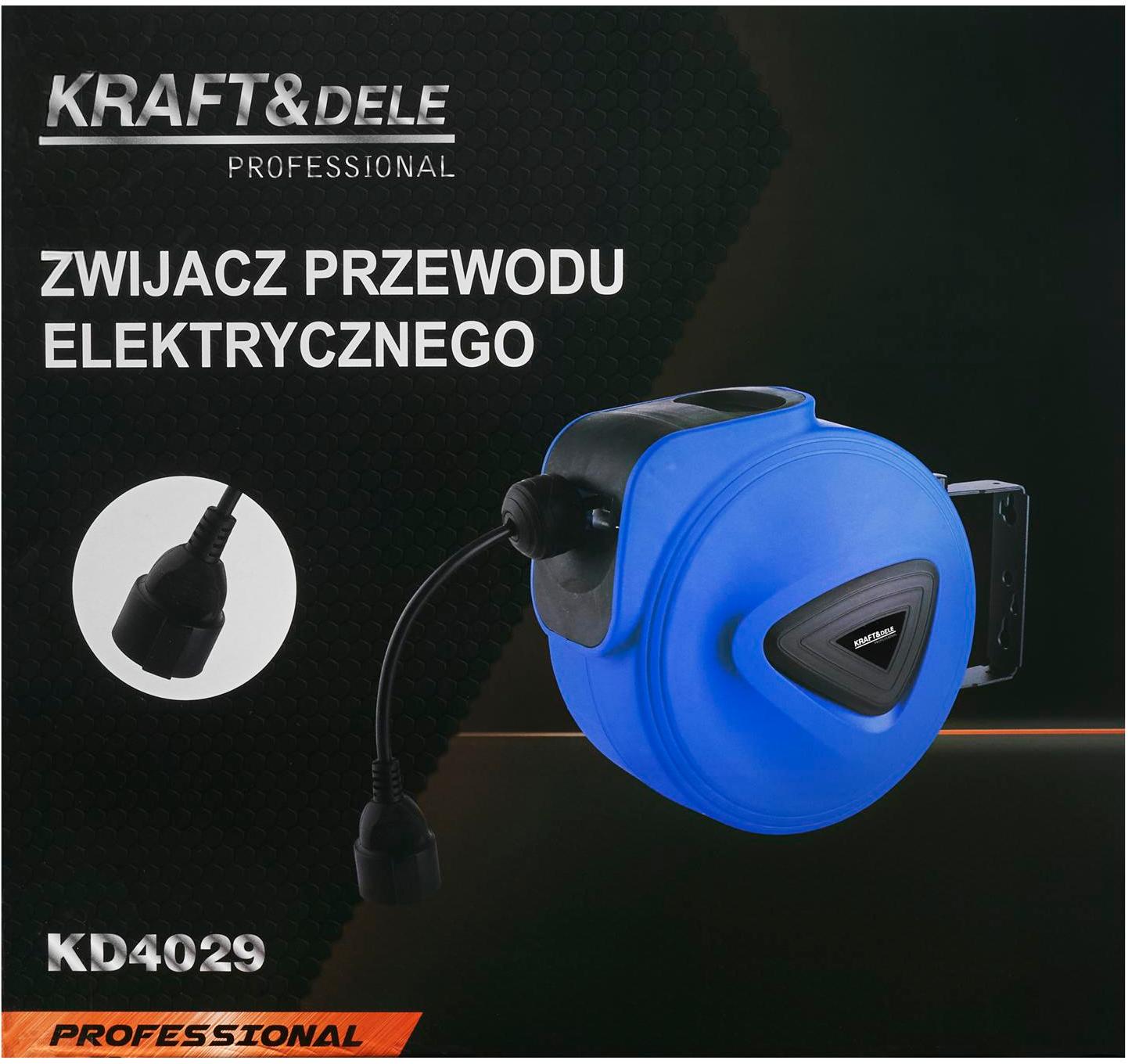 Automatyczny zwijacz kabla elektrycznego marki KRAFT&DELE przeznaczony do stałego montażu w warsztacie, garażu lub ogrodzie. Urządzenie wyposażono w mechanizm automatycznego zwijania z blokadą na wybranej długości, zabezpieczenie termiczne oraz gniazdo z ochroną przed dziećmi.